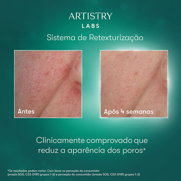 - O Artistry Labs Sistema de Retexturização ajuda a textura da pele a parecer 8 anos mais jovem em apenas 4 semanas quando os produtos são usados em conjunto e conforme recomendado.